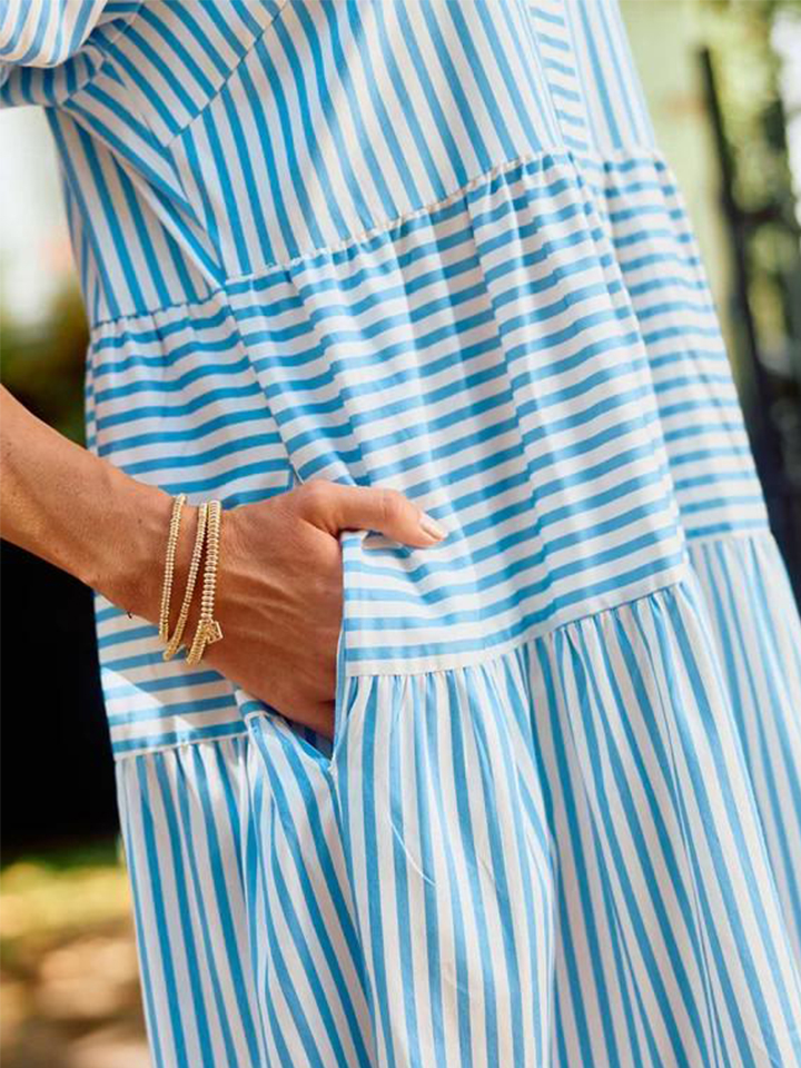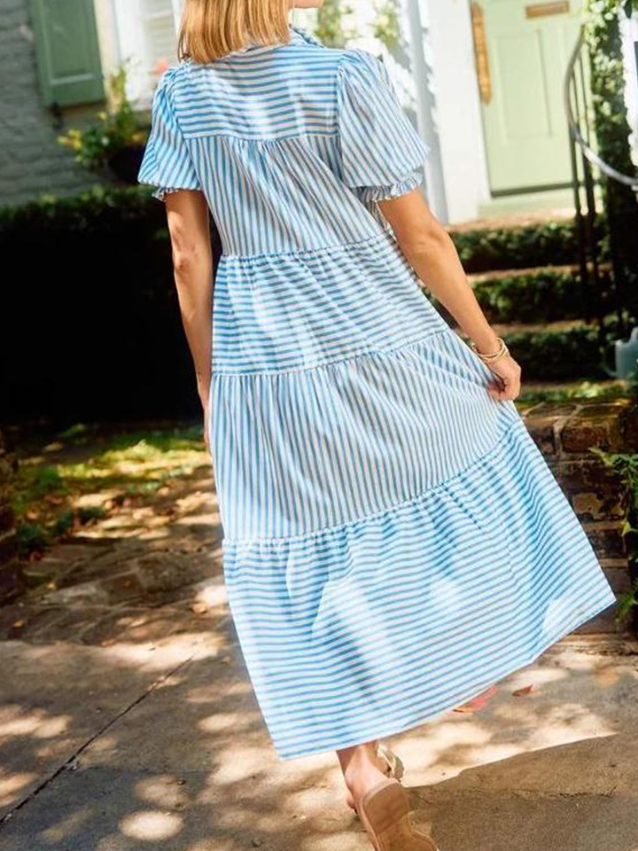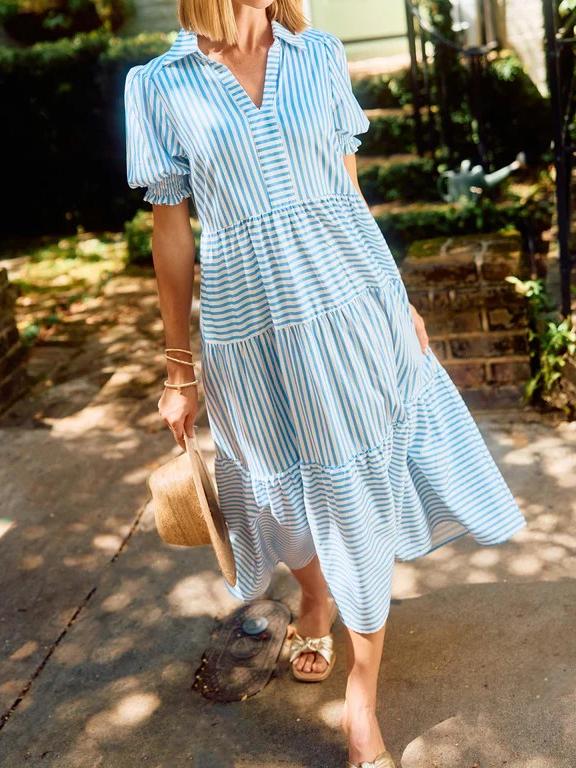 The V-Neck Pleated Short Sleeve Striped Shirt Dress is a delightful blend of sophistication and sweetness that's perfect for any occasion. Falling gracefully at midi-length, this dress exudes timeless charm, making it an ideal choice for both casual outings and special events. The dress features a classic collar, adding a touch of elegance, while the smocked short puff sleeves provide a playful and feminine twist.
