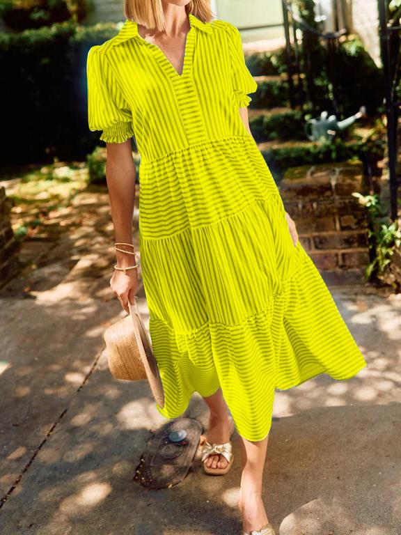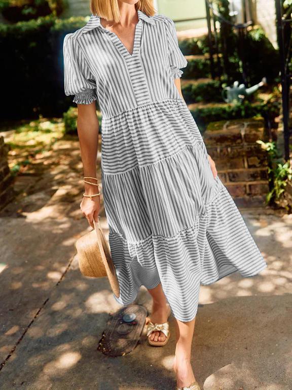 NEW🔥 V-Neck Pleated Short Sleeve Striped Shirt Dress