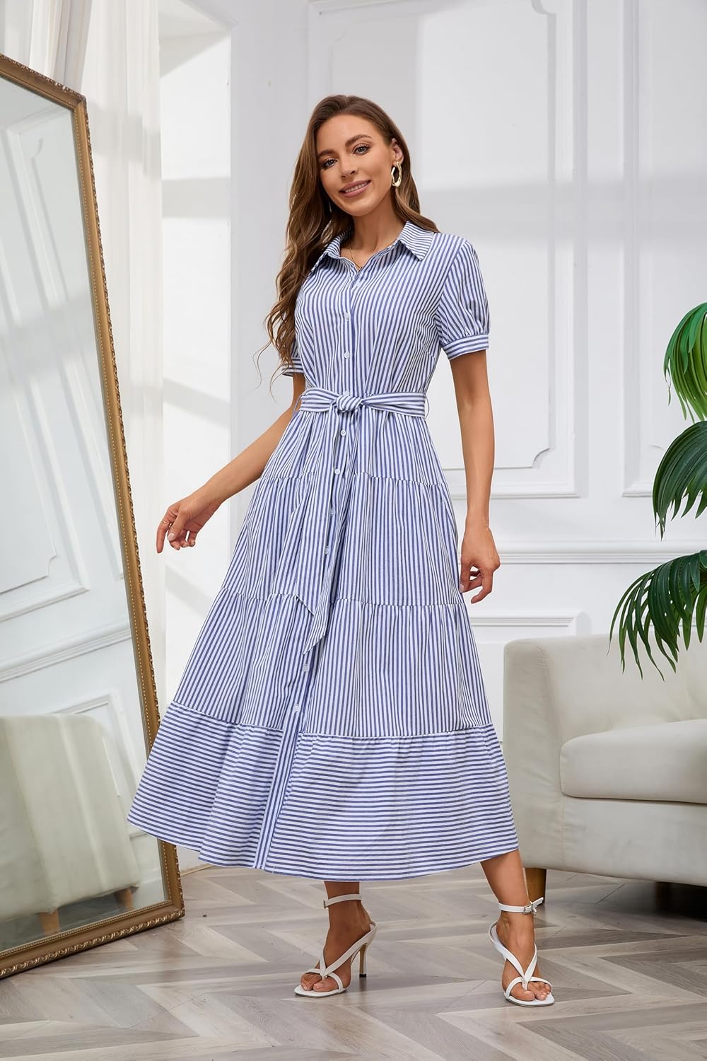 Womens Casual Short Sleeve Button Down Tie Waist Ruffled Striped Maxi Shirt Dress(Buy 2 Free Shipping)